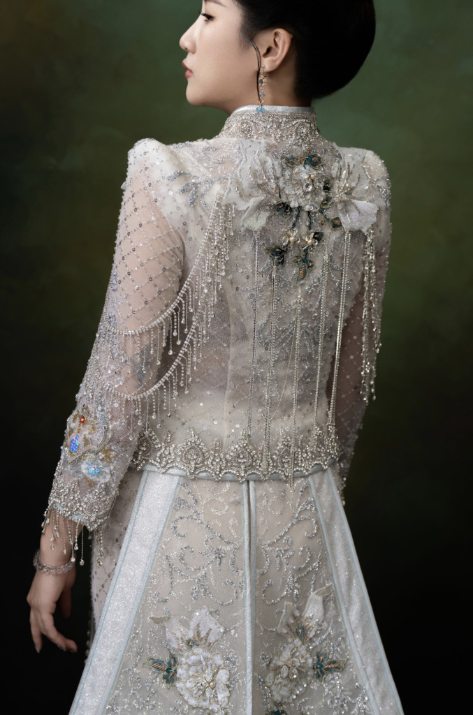 2025禮服新品 錦繡系列|星河夜雨 源自古詩中「銀漢迢迢暗度」的意境,禮服選用輕盈閃紗與淺底色,搭配上碎鑽與刺繡彷彿將夜雨中流轉的星光披於身上細緻的手工亮片與繡線,如雨滴墜入湖面,微光閃動,每一步都似踏在倒映星辰的水上 珠繡與立體花 金線、亮片、水晶與珠玉錯落其間,層層疊疊光影流轉間,彷彿故事靜靜綻放於衣上,不僅是裝飾,更是一種時間的雕刻,是匠人與穿者之間無聲的對話 工藝介紹 刺繡 刺繡,於方寸間藏心意以絲線為筆、布為紙,千針萬縷勾勒出山水花鳥、鳳凰牡丹,圖案寓意深遠,亦承載著傳統的祝願與美意 工藝介紹 其他中式禮服 除了本次的夏日新作,我們亦藏有多款中式禮服珍品:有鳳羽流光的鳳掛、婉轉含蓄的旗袍;亦有男士專屬的中山裝、馬褂與鳳掛,皆為傳統與現代交融之作 其他系列 立即預約試服