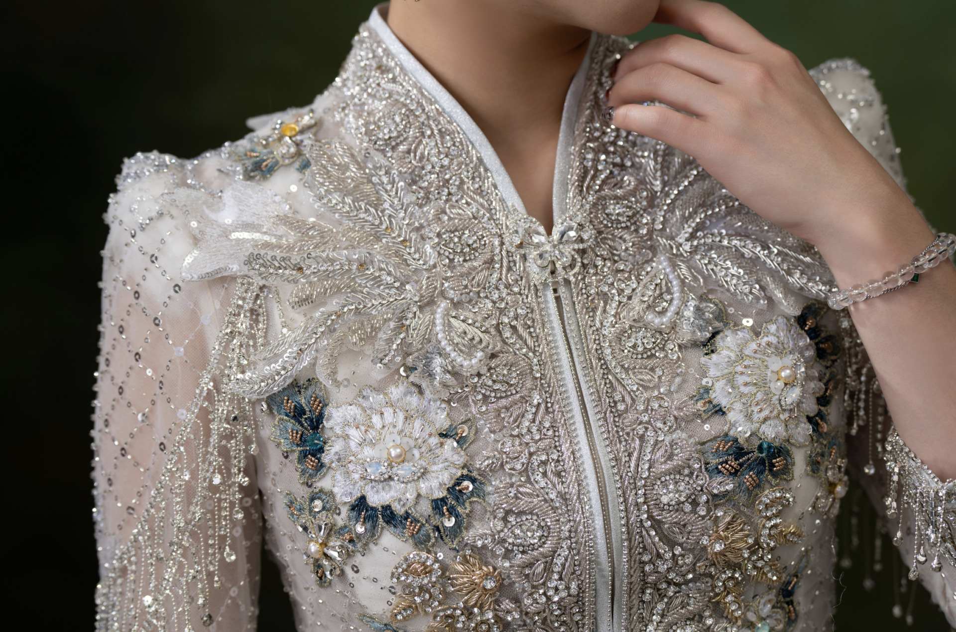 2025禮服新品 錦繡系列|星河夜雨 源自古詩中「銀漢迢迢暗度」的意境,禮服選用輕盈閃紗與淺底色,搭配上碎鑽與刺繡彷彿將夜雨中流轉的星光披於身上細緻的手工亮片與繡線,如雨滴墜入湖面,微光閃動,每一步都似踏在倒映星辰的水上 珠繡與立體花 金線、亮片、水晶與珠玉錯落其間,層層疊疊光影流轉間,彷彿故事靜靜綻放於衣上,不僅是裝飾,更是一種時間的雕刻,是匠人與穿者之間無聲的對話 工藝介紹 刺繡 刺繡,於方寸間藏心意以絲線為筆、布為紙,千針萬縷勾勒出山水花鳥、鳳凰牡丹,圖案寓意深遠,亦承載著傳統的祝願與美意 工藝介紹 其他中式禮服 除了本次的夏日新作,我們亦藏有多款中式禮服珍品:有鳳羽流光的鳳掛、婉轉含蓄的旗袍;亦有男士專屬的中山裝、馬褂與鳳掛,皆為傳統與現代交融之作 其他系列 立即預約試服